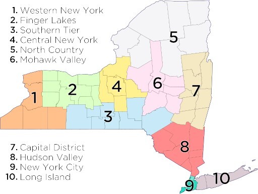 Approximately 6-8 weeks prior to a planned event, we reached out to new departments on the list to introduce ourselves and allow time for follow-up and connection. The cumulative list of contacts who confirmed interest are sent flyers to distribute before each upcoming educational event. These invitations are generally sent approximately two weeks in advance of the event date. To date, 94 departments across the state have been contacted, twenty-nine have responded with interest, and 20 schools thus far have had students both attend and complete the survey (see below regarding Survey). Figure 1 delineates where in New York State these schools are located, and Table 1 indicates the number of schools in each region that responded with interest. Note that more than half the schools are located “upstate,” which is more rural than “downstate,” indicated by regions 9, 10, and parts of 8. Although some regions contain a city (i.e., New York contains New York City), the catchment area surrounding the city is more rural.
