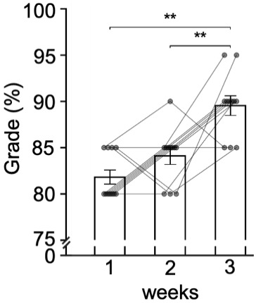 Chalk-talk presentations were also assessed weekly. The grading rubric included the following criteria: (1) effective time management; (2) clarity in presenting the main ideas of the articles; (3) clear explanation of the primary techniques used; (4) ability to raise thoughtful questions; and (5) ability to respond to questions accurately and thoughtfully (Supplementary Table 1). A comparison of student scores over the three weeks revealed a significant improvement, indicating growth in students’ scientific communication skills (Figure 2).