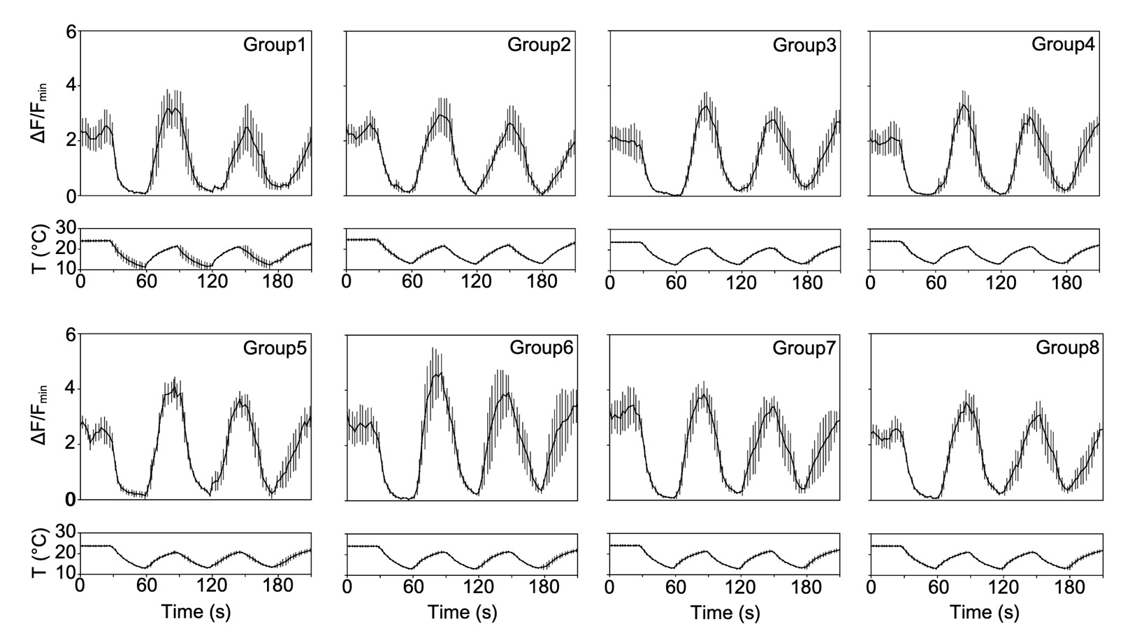 To align calcium activity with temperature stimuli, the Python script (CITbind_dynamic.py) was used to integrate the temperature log with the processed calcium signal data. This script read the fluorescence intensity in the merged calcium signal file (merged_data.csv) and aligned it with the corresponding temperature log recorded during imaging. Time points were matched using the shared POSITION_T index. The script produced synchronized dual-axis plots showing ΔF/Fmin and temperature over time, along with a combined output CSV file for each cell (GitHub: Workflow > Step 7: Align Calcium Signal with Temperature).