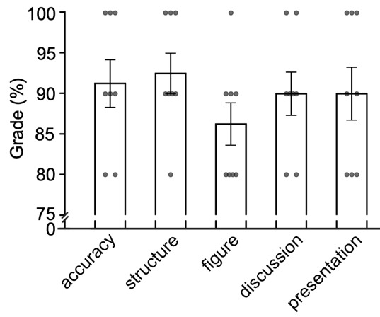 The poster preparation and presentation were evaluated using a grading rubric that included scientific accuracy, poster structure and clarity, quality of figures and figure legends, the depth of interpretation and discussion of results, and the effectiveness of delivery (Figure 6). Scientific writing emerged as a notable weakness, particularly evident in the figure legends. Although every group presented a high-quality figure, students received the lowest scores in the criterion assessing the quality of figures and their legends, primarily due to inaccurate figure legends and poor scientific writing quality (see Discussion).