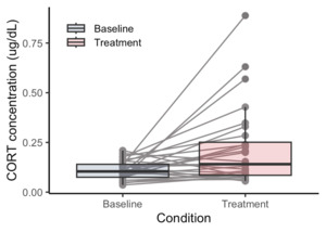 Consistent with predictions, I (and the students!) found that salivary cortisol significantly increased in treatment samples taken after their graded presentation compared to the control samples taken the week before (Paired-sample t-test: t(27) = -2.8701, p = 0.0079, Fig. 1). Of the 28 students for whom we had complete data, 20 students showed a measurable increase in cortisol in the treatment condition.